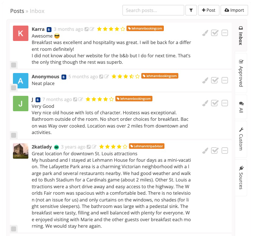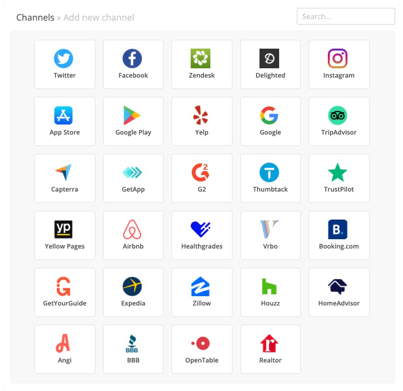 We can import and manage reviews from Twitter, facebook, Zendesk, Delighted, Instagram, App Store, Google Play, Yelp, Google, TripAdvisor, Capture, GetApp, G2, ThumbTack, TrustPilot, Yellow Pages, Airbnb, Heathgrades, VrBo, Booking.com, Get Your Guide, Expedia, Zilow, Houzz, HomeAdvisor, BBB, Open Table and Realtor.