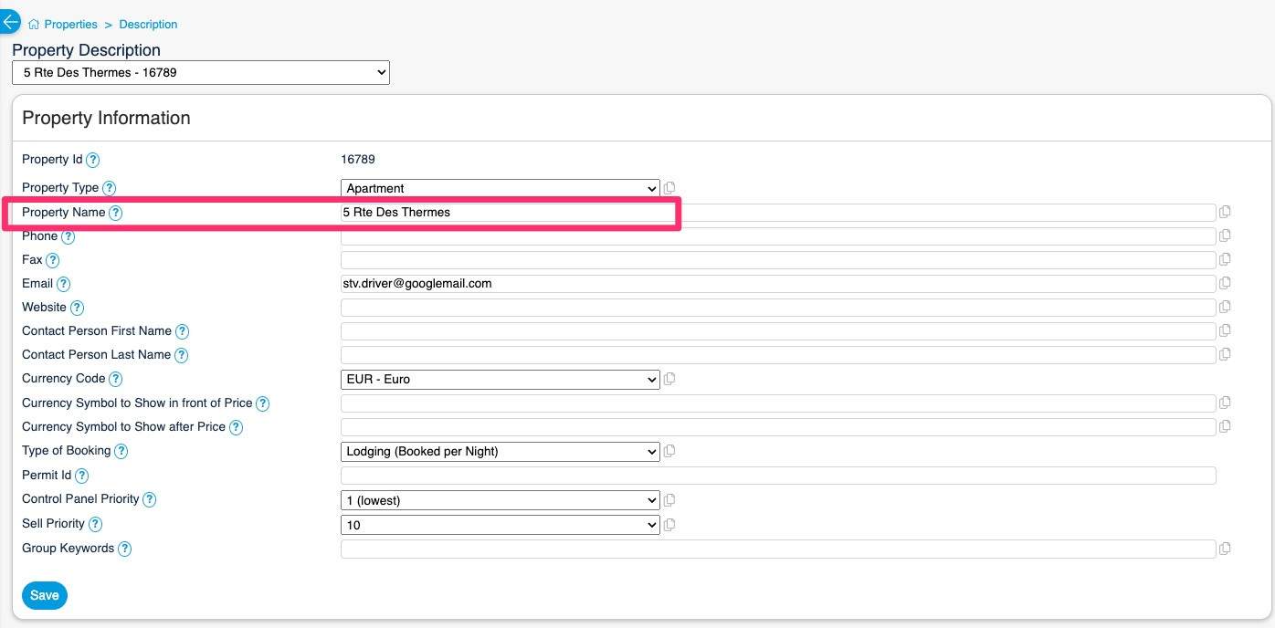 This will appear in the Booking element as the Headline name of the property (Note: Do note use #,*,& or other similar characters in the Property Name as Stripe will not process the transaction)