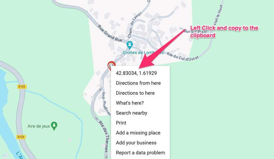 Note: The coordinates will look like this 42.83034386431211, 1.6193079999999997