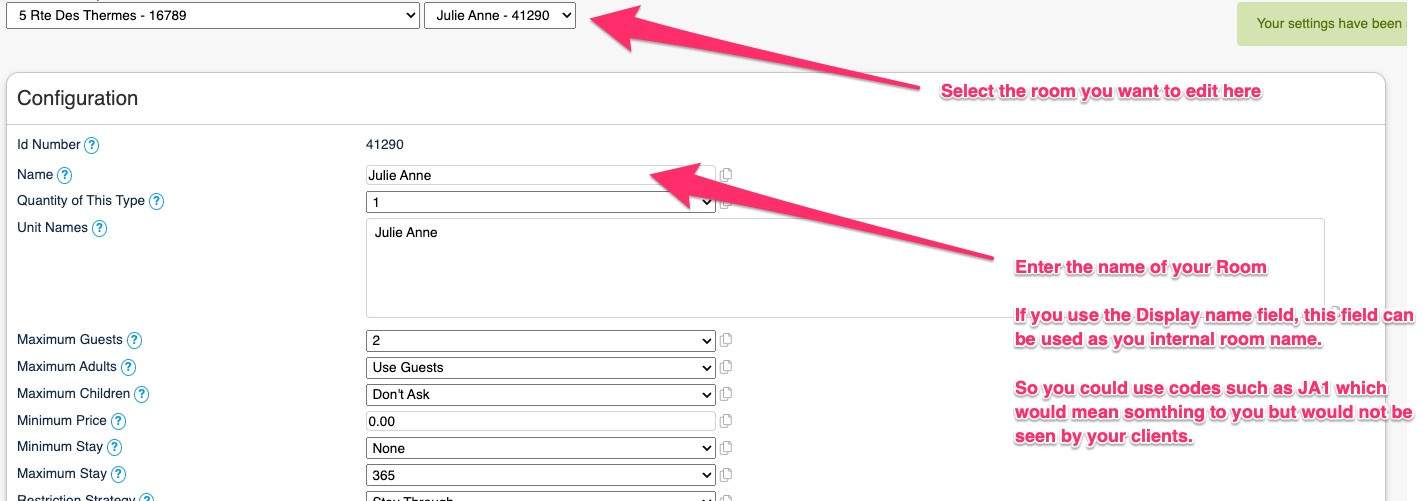 Click Here to create a "Name" for each room, you can set an "Internal Name" for you own use and a "Display Name" for use on the website.